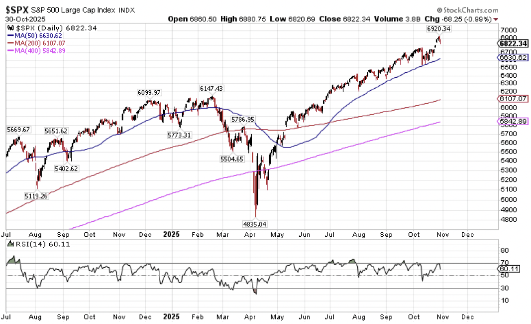 Let’s begin with the S&P 500 chart right above with the S&P 500 trading as much as +12% above its previous all-time highs set in February just before the tariff induced cascade to the downside. As it stands today, the S&P 500 is trading 3% above its medium-term 50-day moving average (blue line). It’s trading 12% above its long-term 200-day moving average (red line). And it’s floating 16% above its ultra long-term 400-day moving average (pink line). Put simply, we as overdue for a sustained correction if not an extended period of consolidation in about a year. And we should not be at all surprised to see the S&P 500 drop by more than 1000 points over a one to three month period from its recent all-time highs, and it would represent nothing more than garden variety mean reversion as part of a continued long-term uptrend dating back more than three years now. But given that we have mostly flown past the historically turbulent period from mid-August to mid-November with flying colors, we should reasonably expect that the U.S. stock market is going to continue to run hot through Thanksgiving and the Santa Claus rally period into early January 2026. As a result, the magnitude of the next eventual garden variety, regression to the mean stock market correction is likely to only get bigger before we finally hit the brakes.