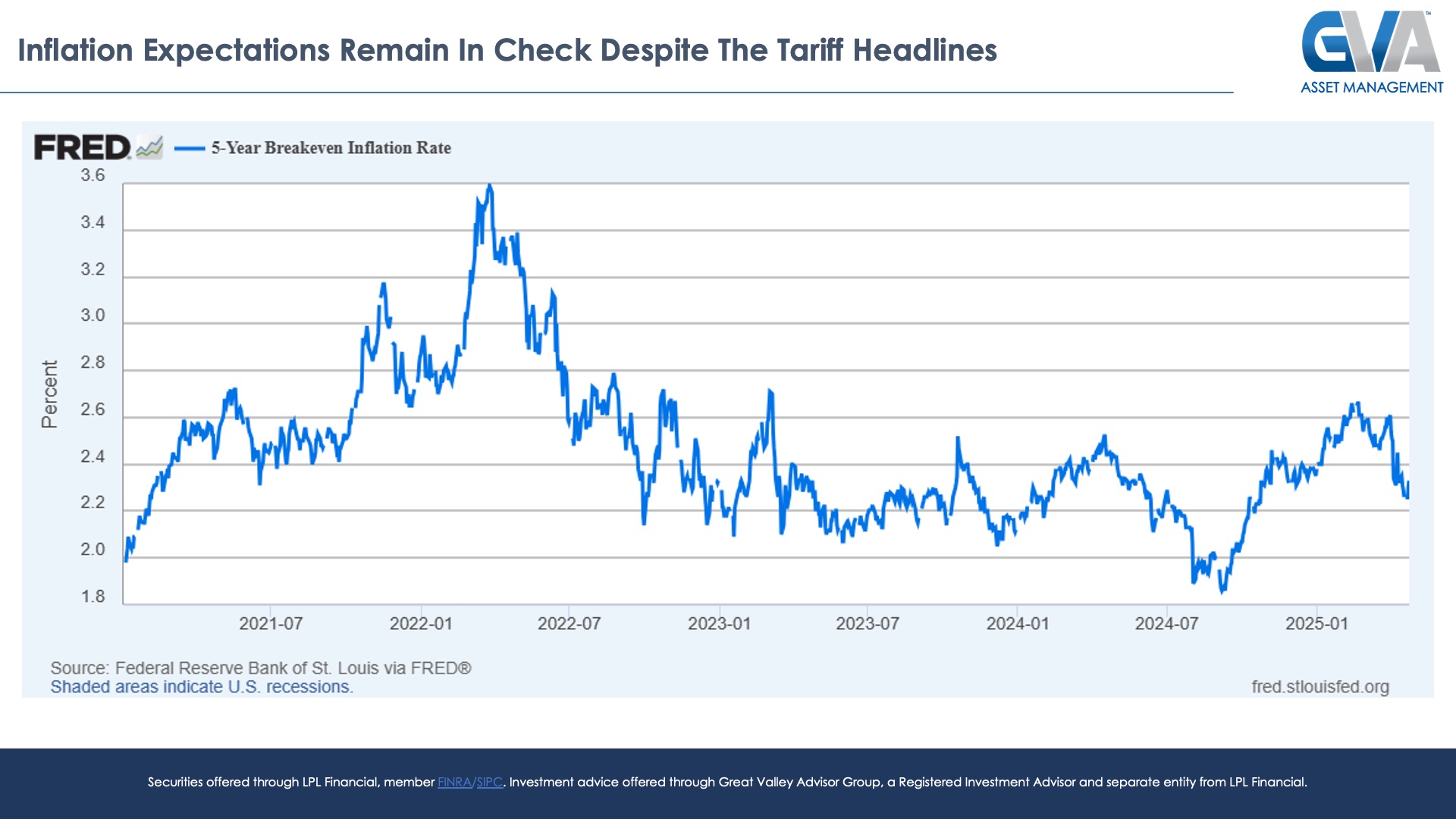 What about inflation? The financial news headlines, after all, continue to alert us on a real time basis that the associated price increases from all around the world are soon coming to our our shores at a popular retailer near you. These price hikes may indeed come to pass, but even if they do, will they be sustained price increases? The market itself clearly does not think so. For unlike 2021 and 2022 when the 5-year breakeven inflation rate was picking up steam for well over a year, this same reading that estimates the projected average inflation rate for the next five years continues to languish at a very disinflationary 2.3%, down more than 30 bps from where we were before the tariffs were announced.