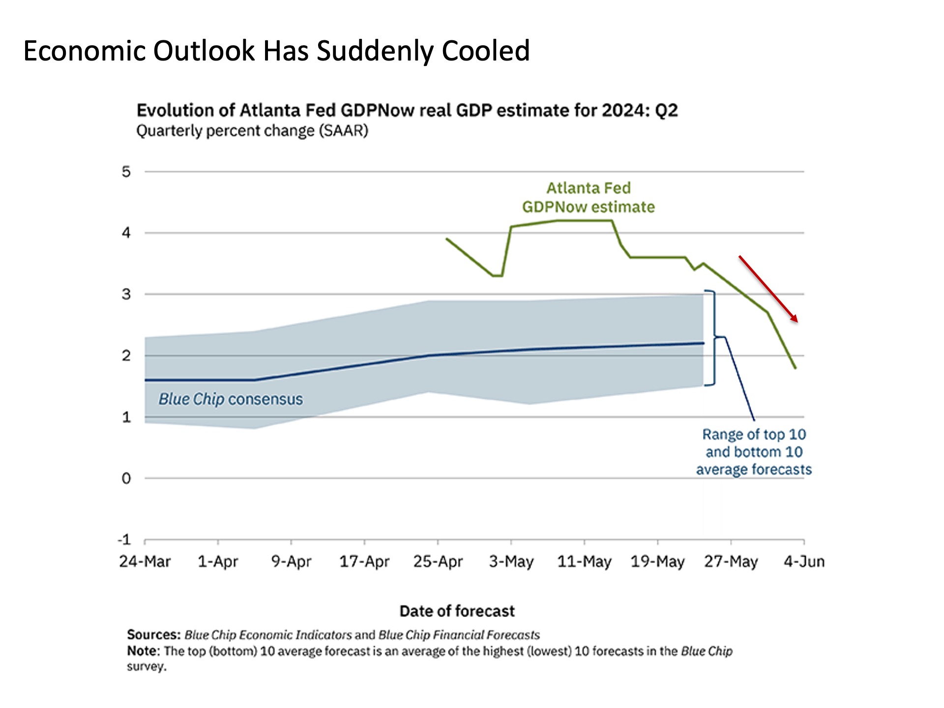 Put simply, projections for U.S. economic growth are suddenly slowing. And various leading indicators suggest that this cooling may continue through the remainder of the year.