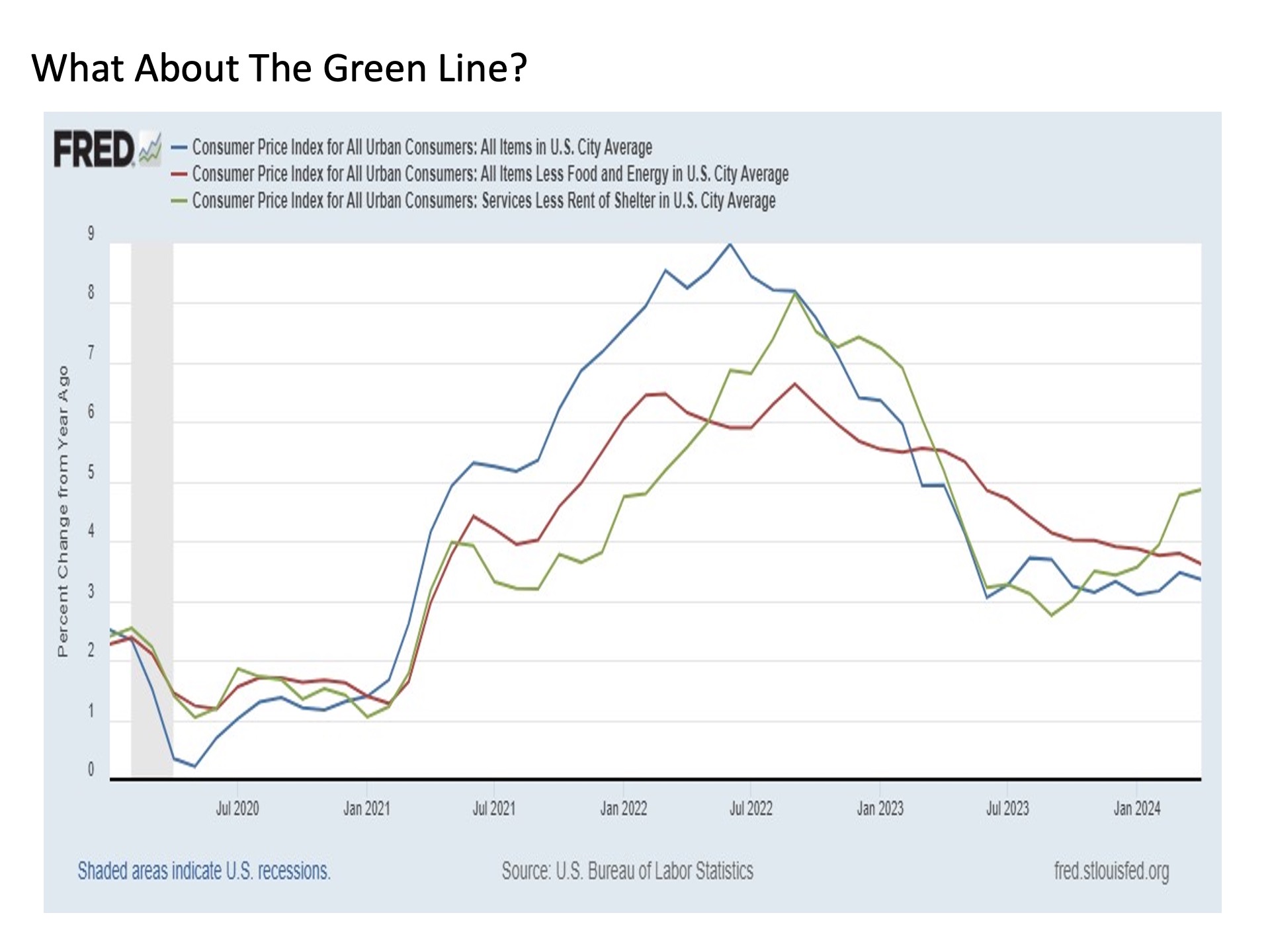 The green line in the chart above is the inflation rate for services in the U.S. economy outside of the cost to own or rent a place to live. Think services like your water and trash collection bills, your doctor bills, your car insurance, your vet bills, and the cost for movie and sporting event tickets among many others. In short, it’s all the things we spend our money on each month in the course of living (and hopefully enjoying) our day to day lives. This services ex shelter inflation rate had been falling since 2022 even faster than the headline readings reaching a low of just 2.8% by last September. But since the end of 2023 and through 2024 so far, this services ex shelter inflation rate fire has roared back to life. As of the latest reading for April 2024, it’s closing in on 5%. Hot, hot, hot!!!