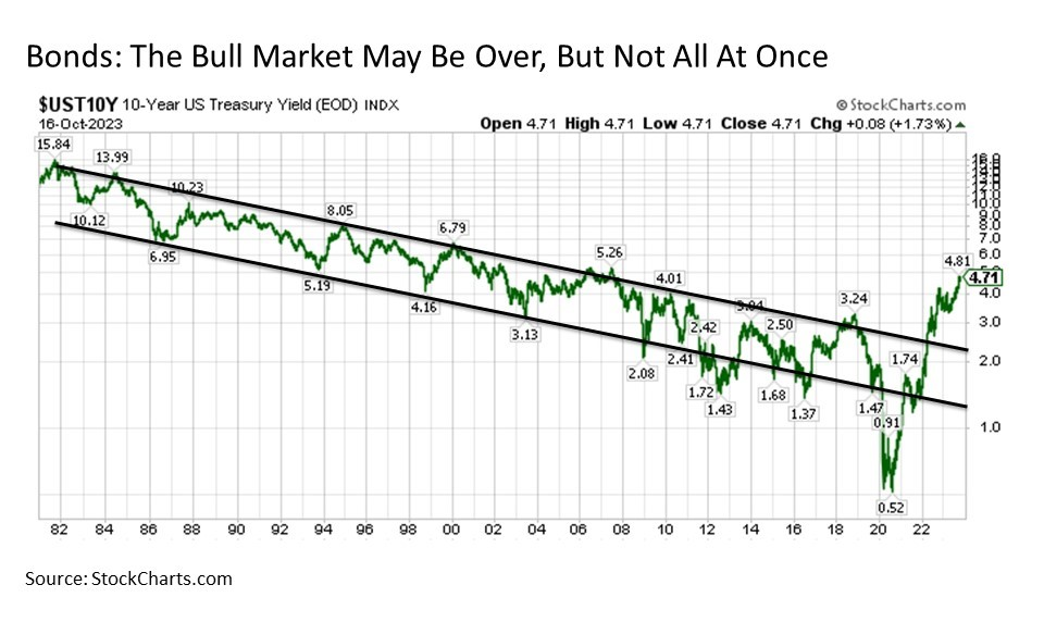Bond views. Stocks are not the only major asset class that has seen their share of recent difficulties. The largest outbreak of inflation since the 1970s sent bond yields soaring in 2022. And following a brief respite in the first part of 2023, yields have since surged to new cycle highs.
