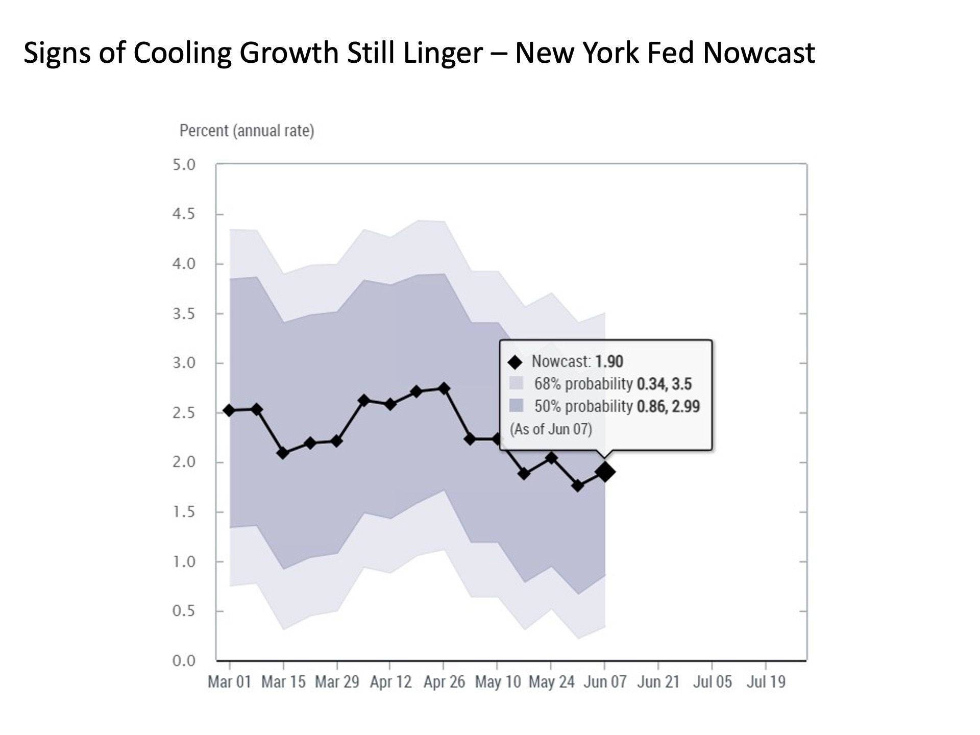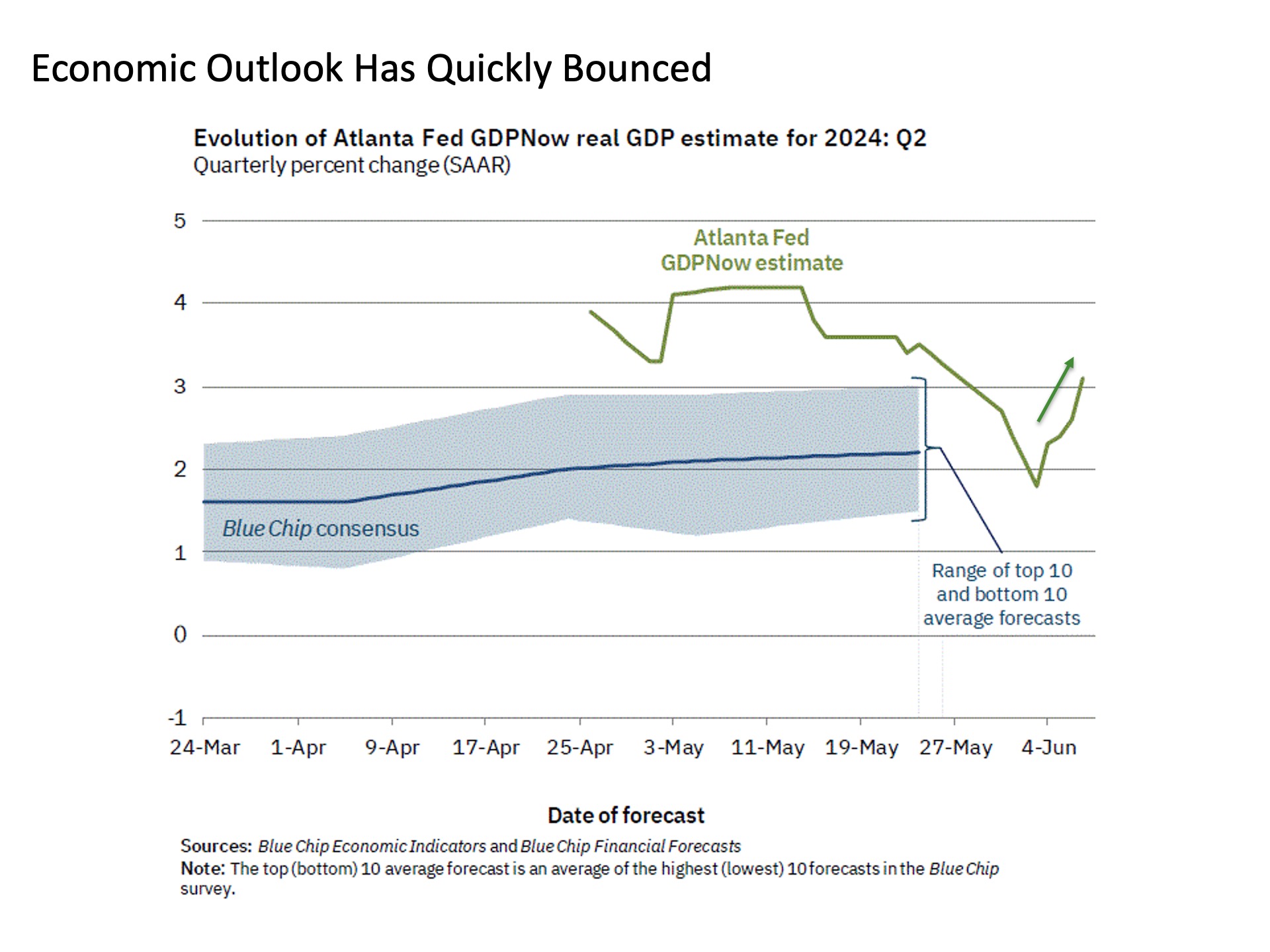 Revitalized growth outlook with qualifications. After cascading lower for a few weeks into the start of June, the forecast for economic growth according to the Atlanta Fed GDP Now has quickly bounced back to life. Since bottoming at 1.8% on June 3 at levels below the consensus of blue chip economists for the first time in recent memory, current projections have surged back above 3% thanks to strong employment and trade readings in recent days.