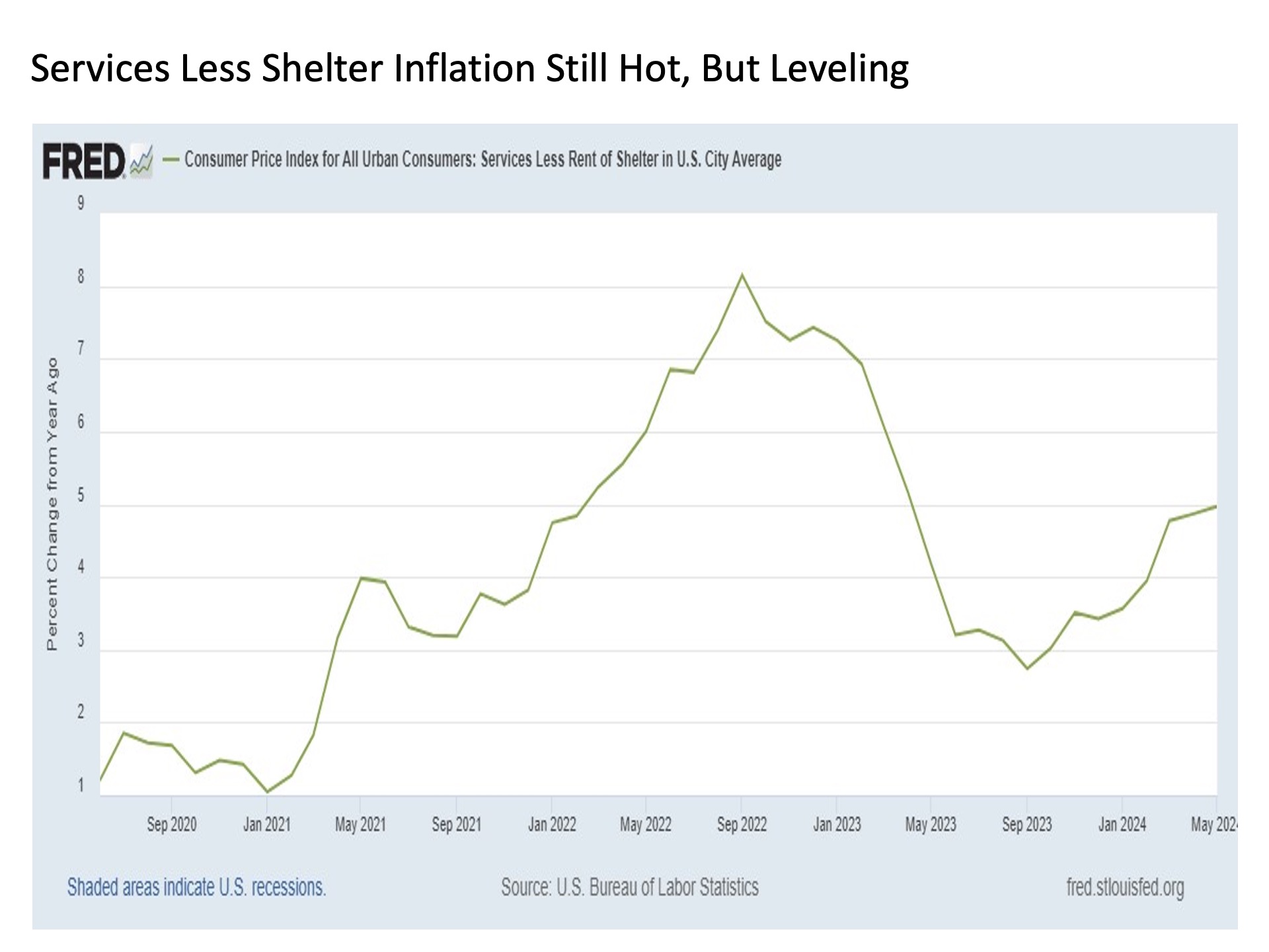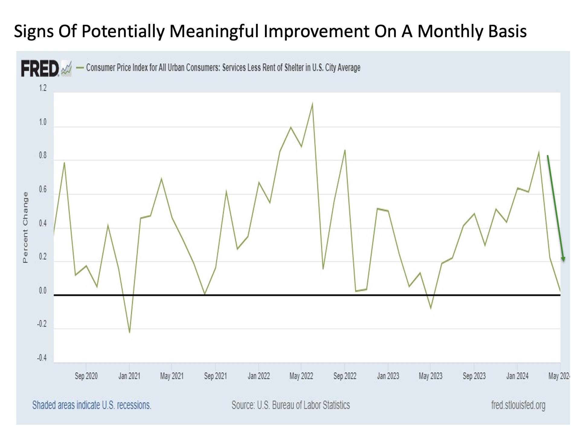 Building on these more constructive recent developments, services ex shelter inflation on a month-over-month basis. For after steadily rising since May 2023 on a month-over-month basis to a peak as recently as March 2024, this reading as suddenly plummeted over the last two months to virtually flat in May. This is a positive development, as it preliminarily suggests that some of the pricing pressures lurking underneath the headline surface may be abating.