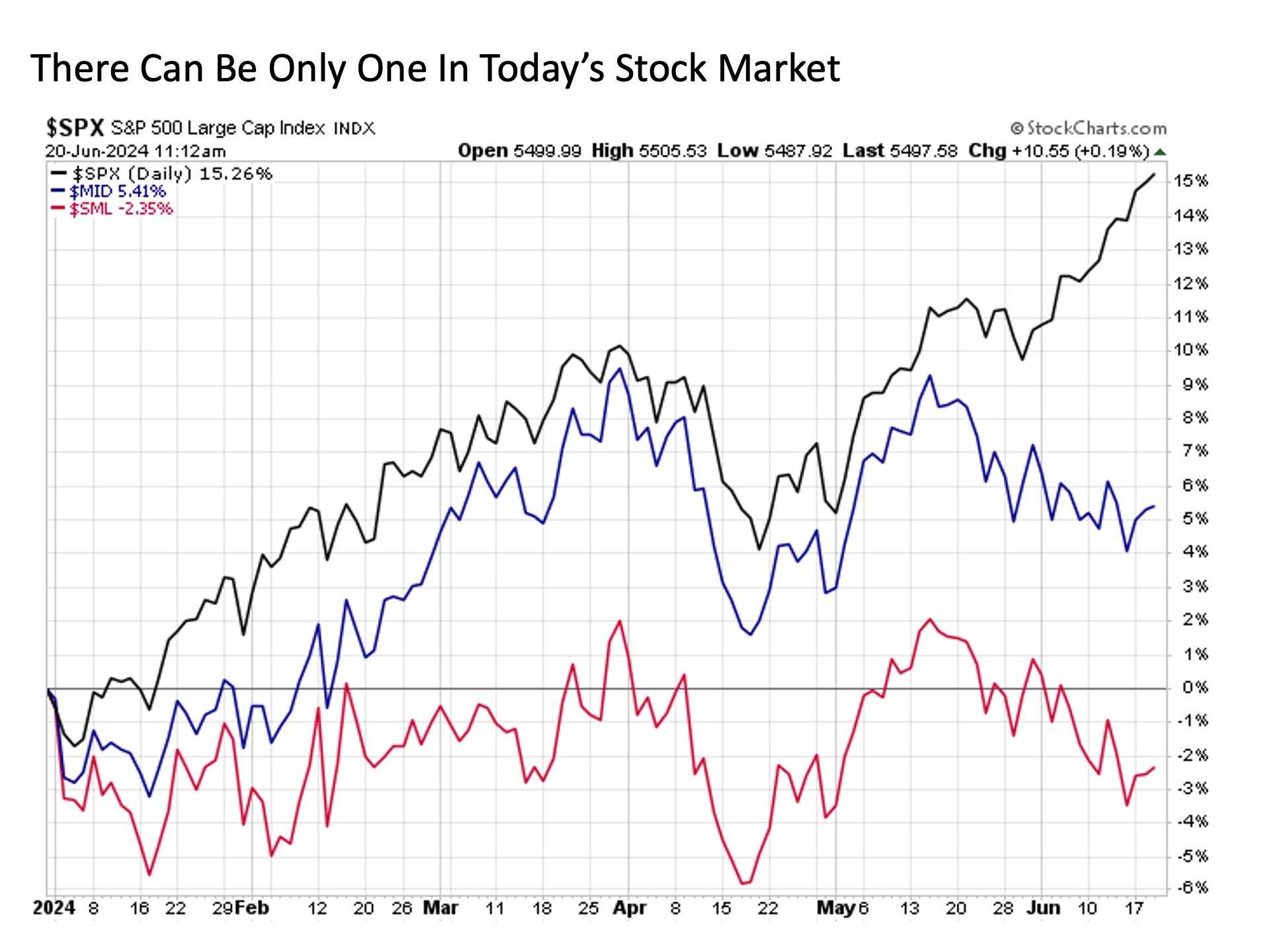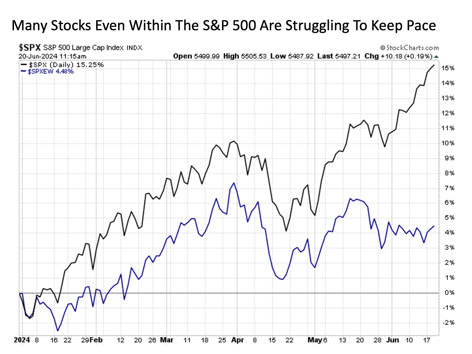 The U.S. stock market is off to a roaring start in 2024. We are not even half way through the year yet, and the S&P 500 Index is higher by more than +15%. Sounds fantastic, right? It is definitely great news on a headline basis, but unfortunately all is not necessarily well with the broader stock market. A closer look underneath the surface reveals that the market is not nearly as healthy as the headline return might imply.