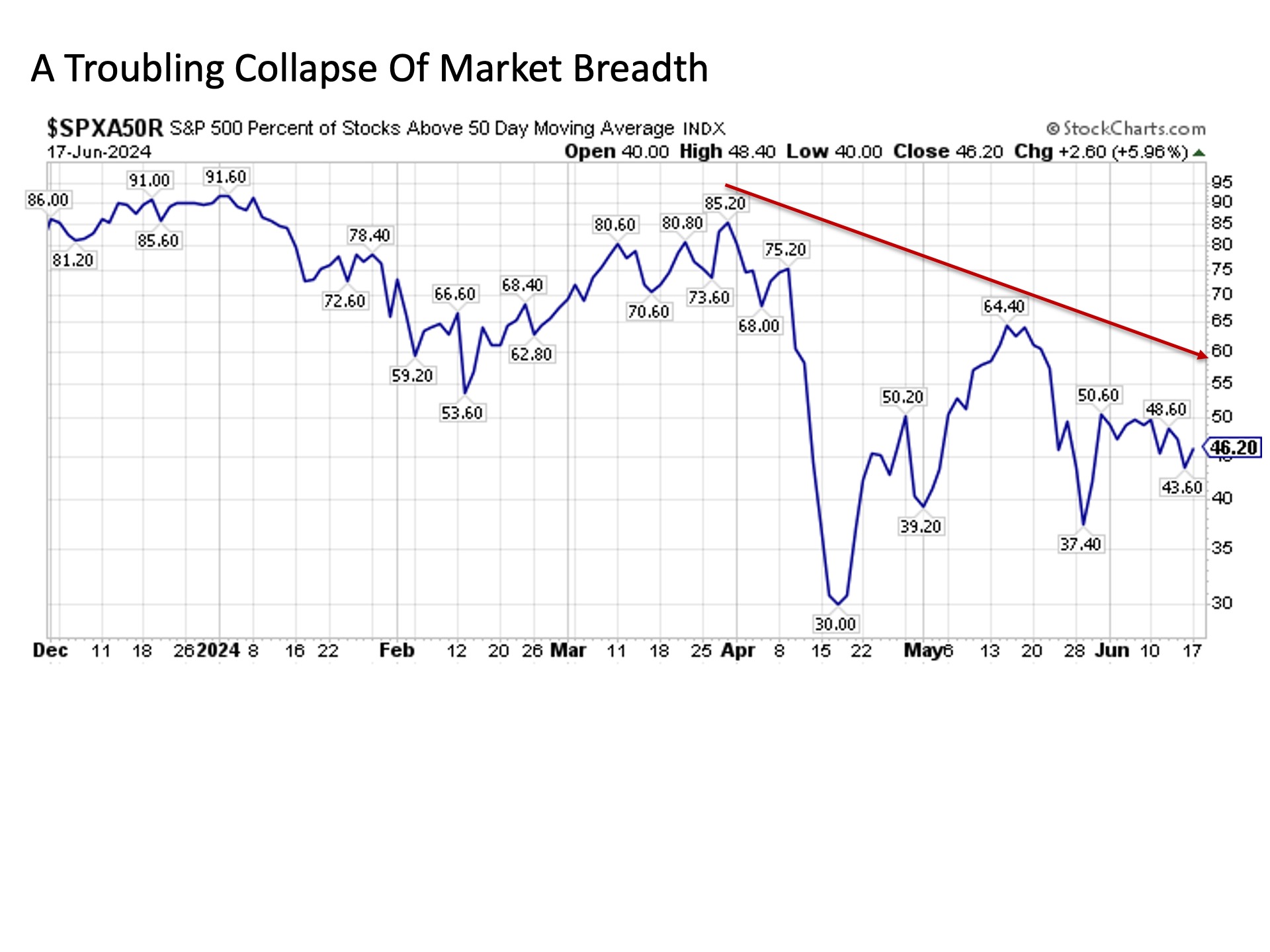 But over the course of the second quarter, we’ve seen marked narrowing of breadth. Today, despite the S&P 500 striking fresh new all-time highs, less than 50% of stocks within the index are trading above their respective 50-day moving averages. This is a potential problem, because if one of these remaining stocks that are driving the market higher steps on a proverbial landmine, a diminishing number of stock market solders remain to continue the market advance.