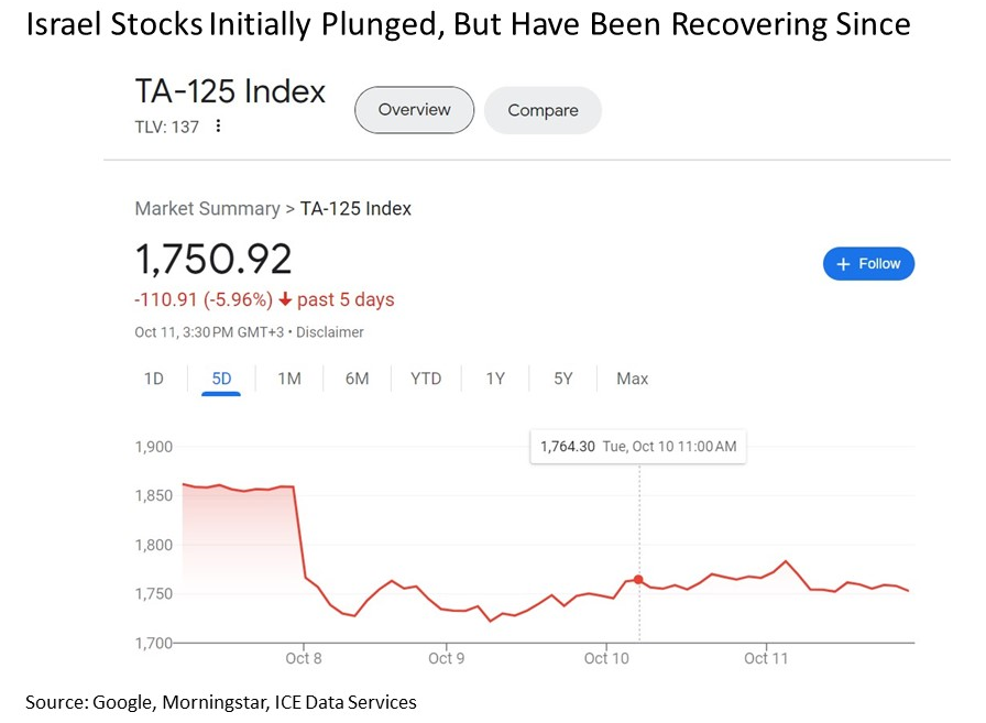 Looking closer toward the epicenter. What about the financial markets most directly impacted by the invasion? Stocks most directly affected would be those in Israel. And unlike the U.S. where trading takes place from Monday through Friday, the Tel Aviv Stock Exchange is open from Sunday through Thursday. As a result, the financial market impact was to be felt sooner in Israel. The downside among Israel stocks was initially swift as would have been reasonably expected, as the Tel Aviv 125 Index dropped by more than -7% in the first three hours of trading on Sunday, but much like the U.S. on Monday, Israel stocks effectively bottomed and have been slowly making their way back to the upside in the trading days since.