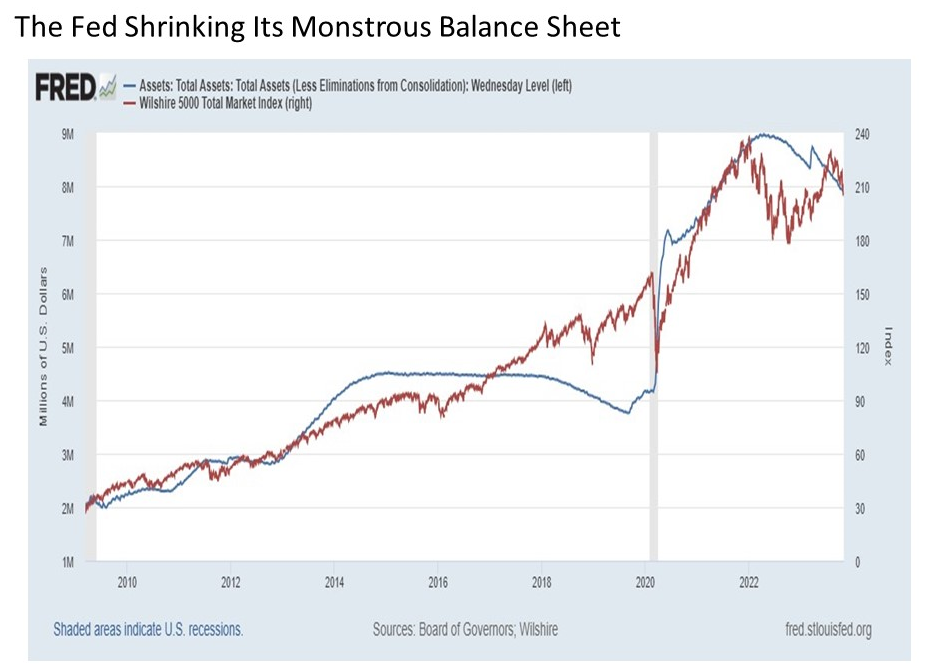 Shrinking monster. Monetary policy actions from the U.S. Federal Reserve have been a primary determinant of market returns dating back to the Ben Bernanke “Green Shoots” interview coming out of the Great Financial Crisis in March 2009. Over the 13 year period from early 2009 to early 2022, the Fed exploded its balance sheet by nearly five times through a series of “quantitative easing” large scale asset purchase programs. The goal of these programs was to stimulate sustainably strong economic growth through a “wealth effect” while also warding off the deflation demons by bringing inflation up to the somewhat arbitrary target rate of 2%. While the programs continuously failed in generating much more than sluggishly artificial economic growth and chronically below target inflation, they did wonders in stoking asset prices like stocks in a big way.