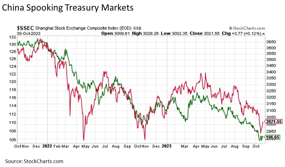 Red market scare. The China economy and its markets have been struggling for some time now. The commercial real estate boogeyman that remains elusive here in the United States has been alive and well and on a rampage in China. And asset management firms have been buckling under the challenging operating environment and increased regulatory intervention by Chinese authorities. Given that U.S. assets are intertwined with financial activity in China in many ways, we have seen this downside pressure feed through to weakness in the U.S. Treasury market in a meaningful way over the past two years.