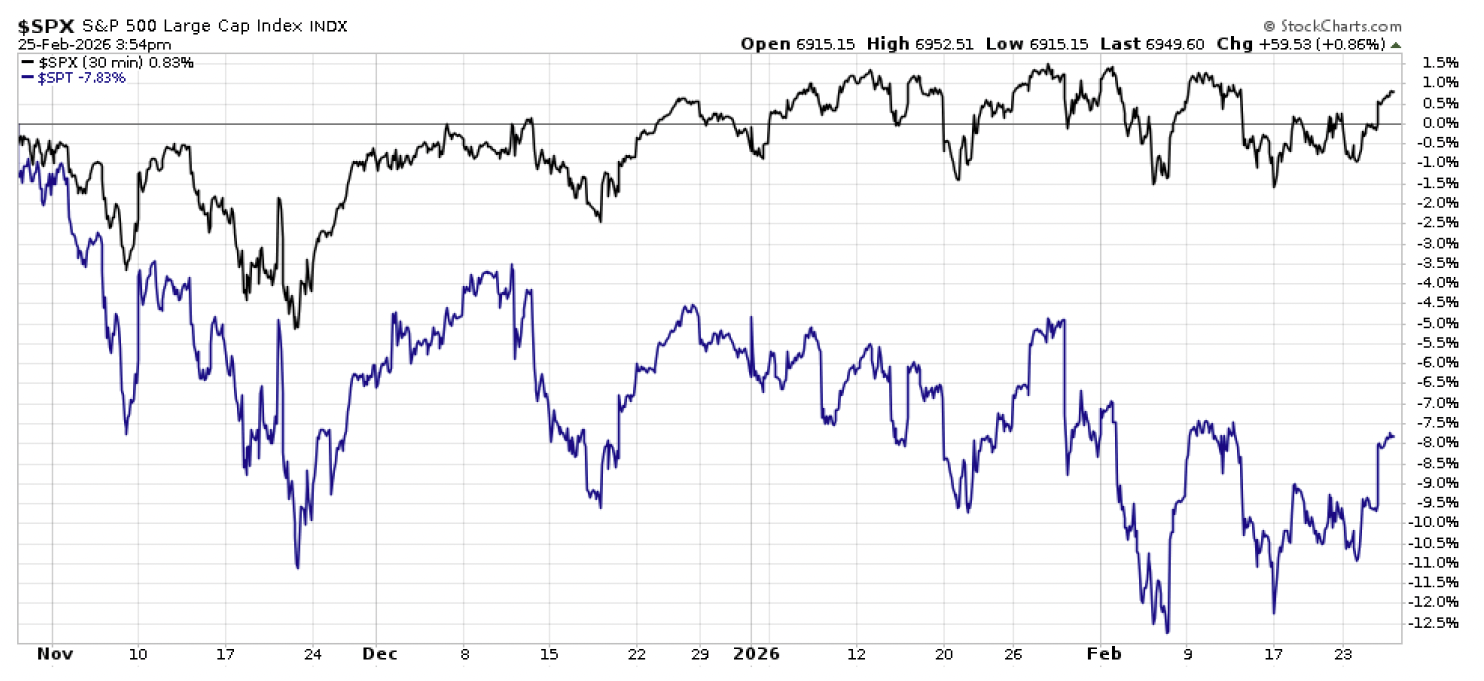 A new season underway. So what does the new tech reality look like as we work through the winter of 2026? The old moon first started falling on the tech sector all the way back around Halloween, and the storm clouds are slowly continuing to accumulate. Consider the chart below showing the cumulative return of the S&P 500 versus the Information Technology sector since October 30, 2025. While the S&P 500 is essentially flat at up less than +1% over this time period, the tech sector is lower by nearly -8%.